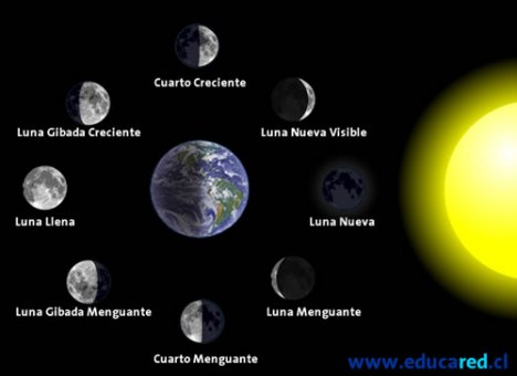La luna gira alrededor de la tierra. La combinación de los movimientos lunares de rotación y translación originan la ocultación de una región de la superficie lunar. Las fases de la luna se completan en un periodo de 29 días llamando lunación.